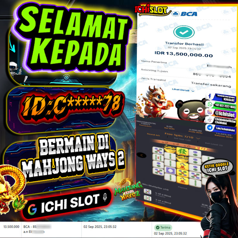 Selamat kepada User id : C*****78 Telah berhasil mendapatkan kemenangan besar pada permainan GATES OF OLYMPUS x1000 kemenangan Sebesar Rp.13.500.000, Setelah mengisi formulir withdraw dengan kurung waktu hanya 5 – 10 menit pihak ichislot sudah melakukan transfer kepada pemilik Userid dan dana sudah dapat di cairkan oleh pemenang. Bukti pembayaran yang kami berikan merupakan bukti pembayaran yang SAH / VALID yang langung di dapatkan melaui tanda transfer transaksi dari Bank yang di tuju.