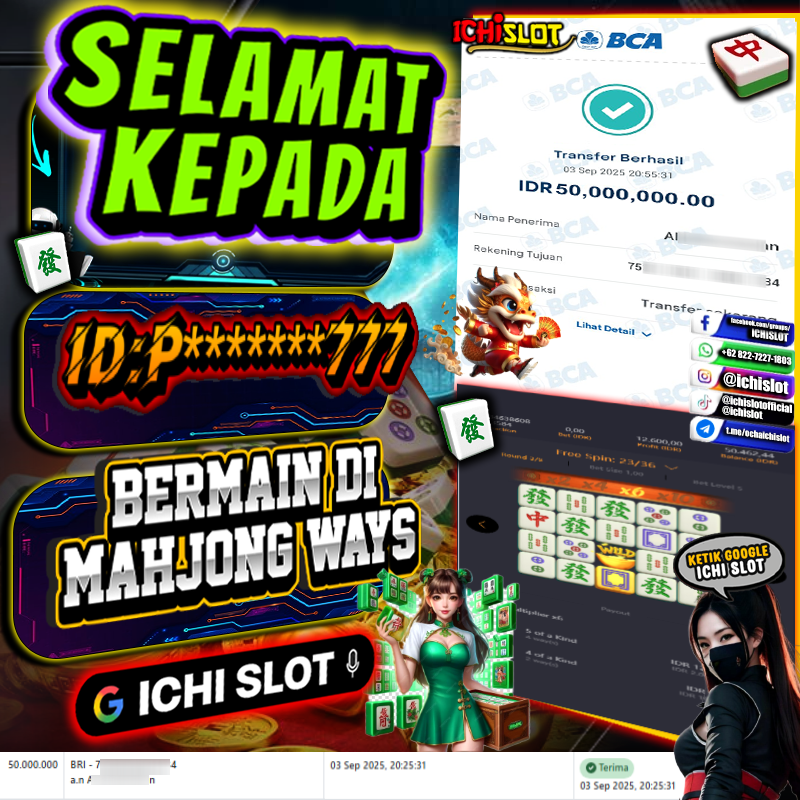 Selamat kepada User id : P*****777 Telah berhasil mendapatkan kemenangan besar pada permainan MAHJONG WAYS kemenangan Sebesar Rp.50.000.000, Setelah mengisi formulir withdraw dengan kurung waktu hanya 5 – 10 menit pihak ichislot sudah melakukan transfer kepada pemilik Userid dan dana sudah dapat di cairkan oleh pemenang. Bukti pembayaran yang kami berikan merupakan bukti pembayaran yang SAH / VALID yang langung di dapatkan melaui tanda transfer transaksi dari Bank yang di tuju.